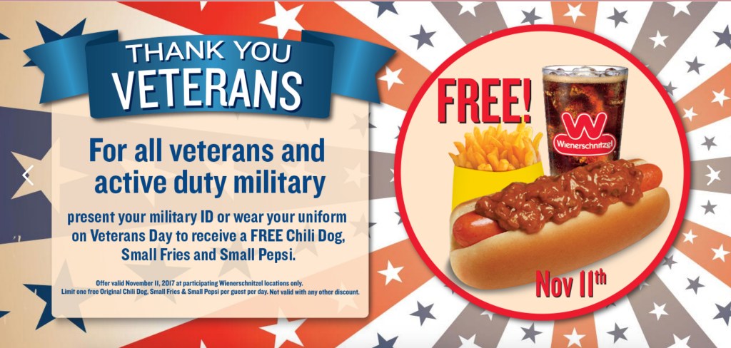 All veterans and active duty military can grab a free Chili Dog, Small Fries, and a Small Pepsi on November 11th from Wienerschnitzel. Just present your military ID or wear your uniform.